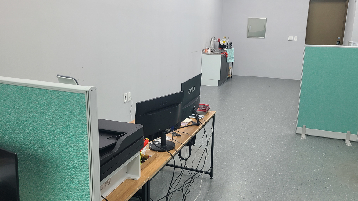 안쪽에 책상 간 서로 분리했고, 입구 쪽에 냉장고와 회의(다용도) 테이블을 가려지게 배치했습니다.