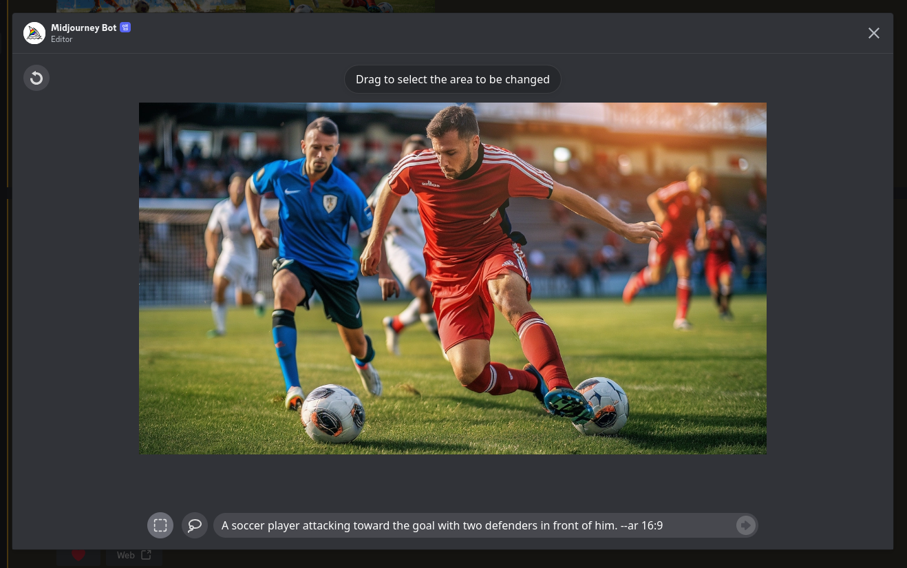 공격수 왼발 뒤쪽에 있는 축구공을 선택한 다음 바꾸고 싶은 이미지를 프롬프트에 입력하면 됩니다.
