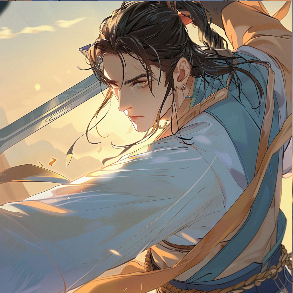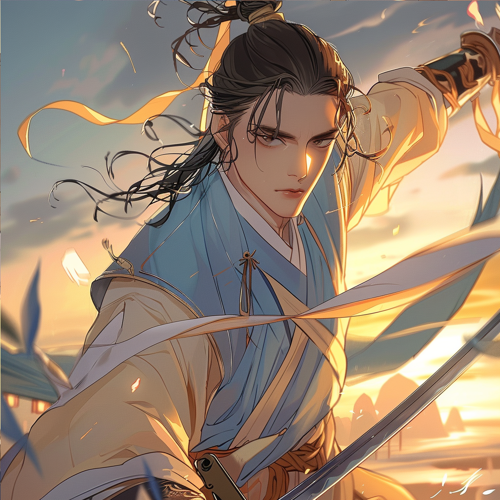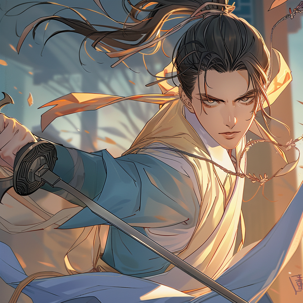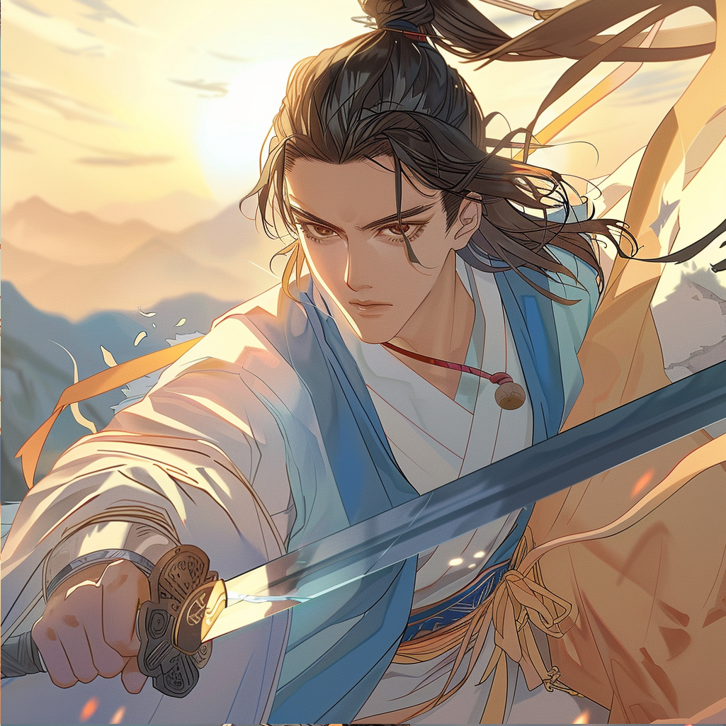 Chinese martial arts novel protagonist swing long sword in one hand, korean webtoon style --cref 이미지주소 --sref 이미지주소