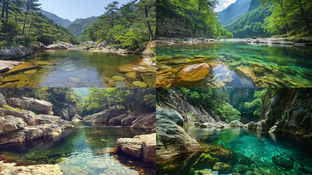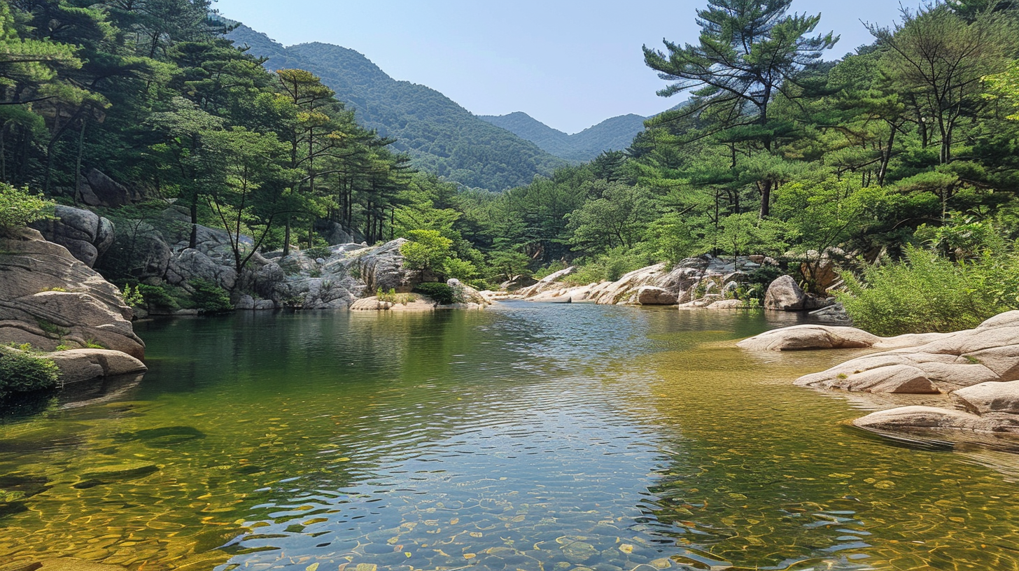 A valley with cool, clear water in Korea. The season is summer. --ar 16:9