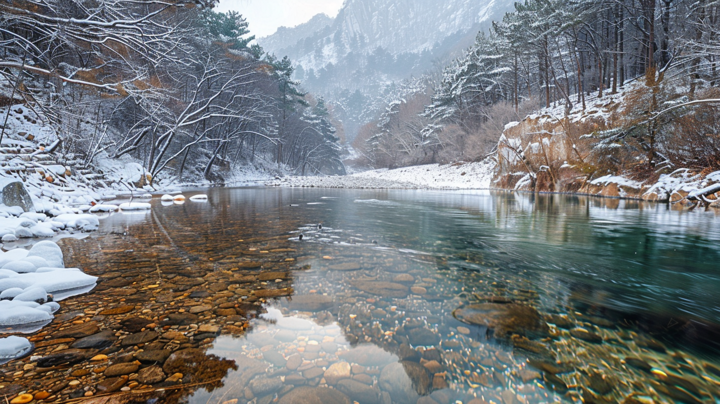 A valley with cool, clear water in Korea. The season is winter. --ar 16:9