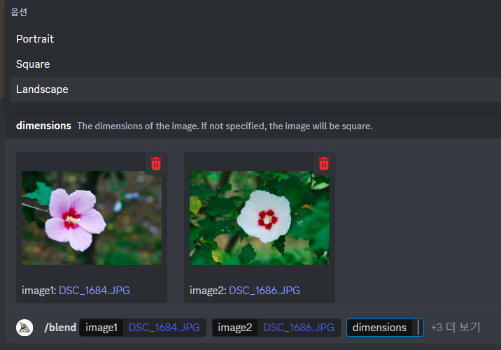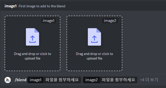 프롬프트 창에 /blend 입력 후 한 칸 띄우면 위 이미지와 같이 파일 첨부 창이 보이게 됩니다. 드래그 또는 클릭해서 첨부할 이미지를 업로드하면 됩니다.