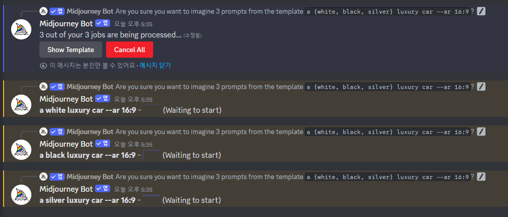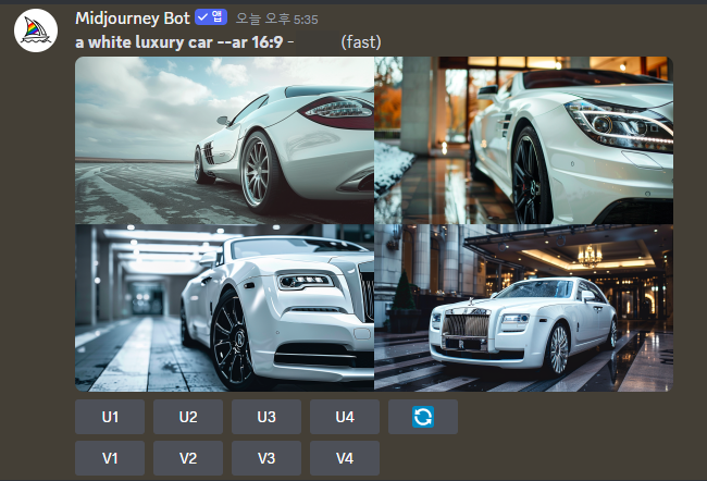 프롬프트창에 a {white, black, silver} luxury car --ar 16:9 를 입력해 봤습니다.