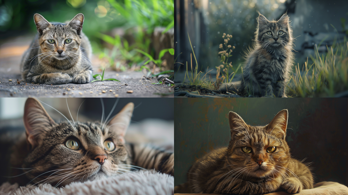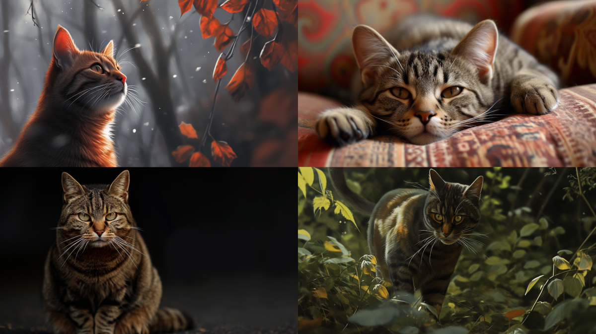 간단하게 a cat --q .25 --ar 16:9 부터 .5, 1 세 번 진행해 봤습니다. 순서대로 .25 / .5 / 1의 결과물입니다.
