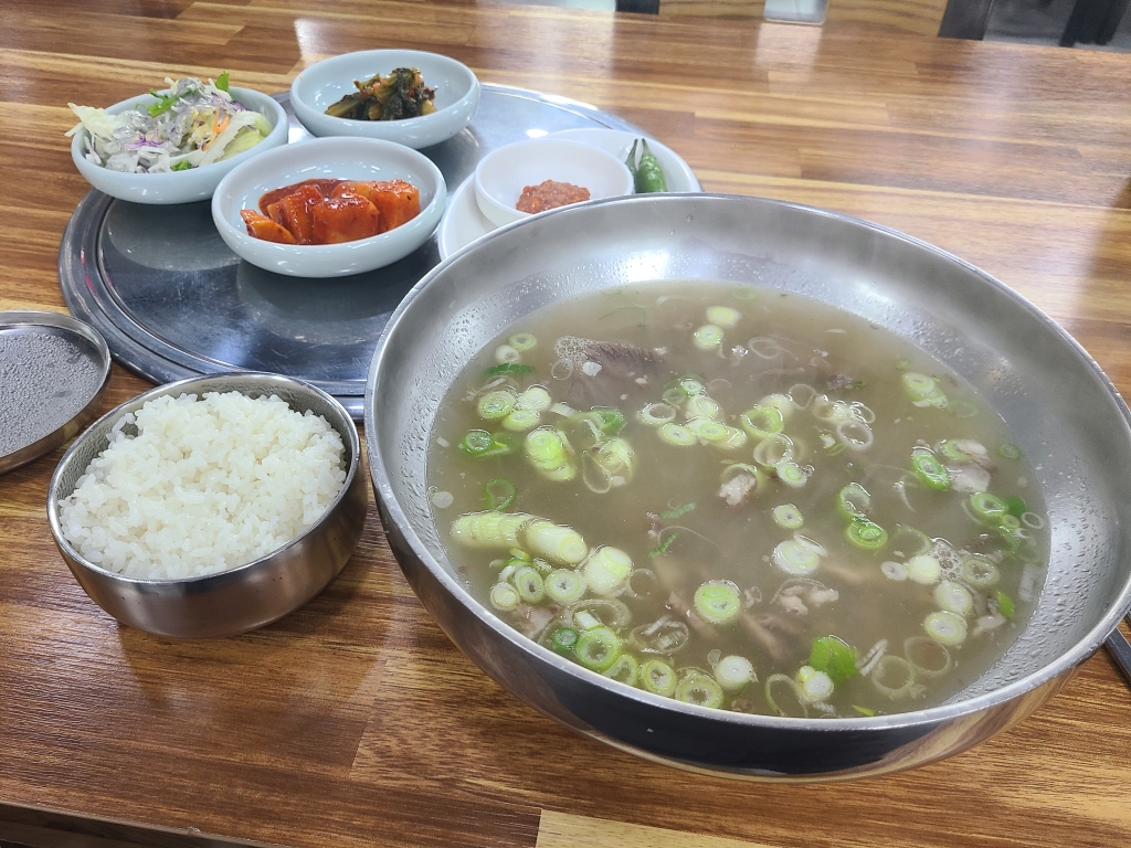주문한 소머리곰탕이 나왔습니다. 쌀쌀해진 날씨에 뜨끈한 국물이 몸을 녹여주네요. 함께 나온 반찬들도 깔끔합니다.