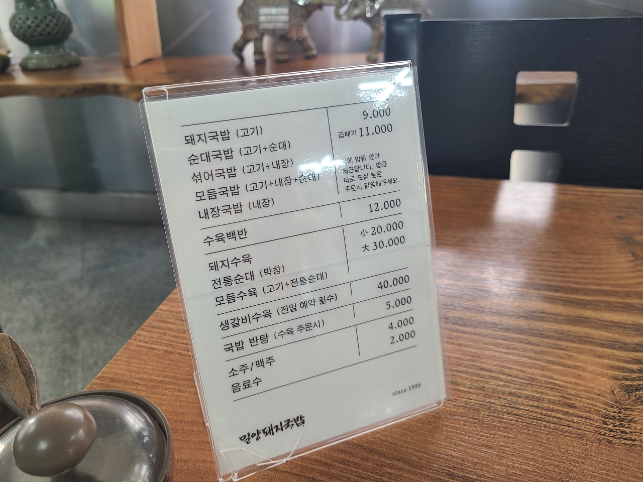 돼지국밥이랑 순대국밥 등 판매하고 있습니다. 국에 밥을 말아서 나오기 때문에 따로 먹으려면 주문할 때 말해주면 됩니다.